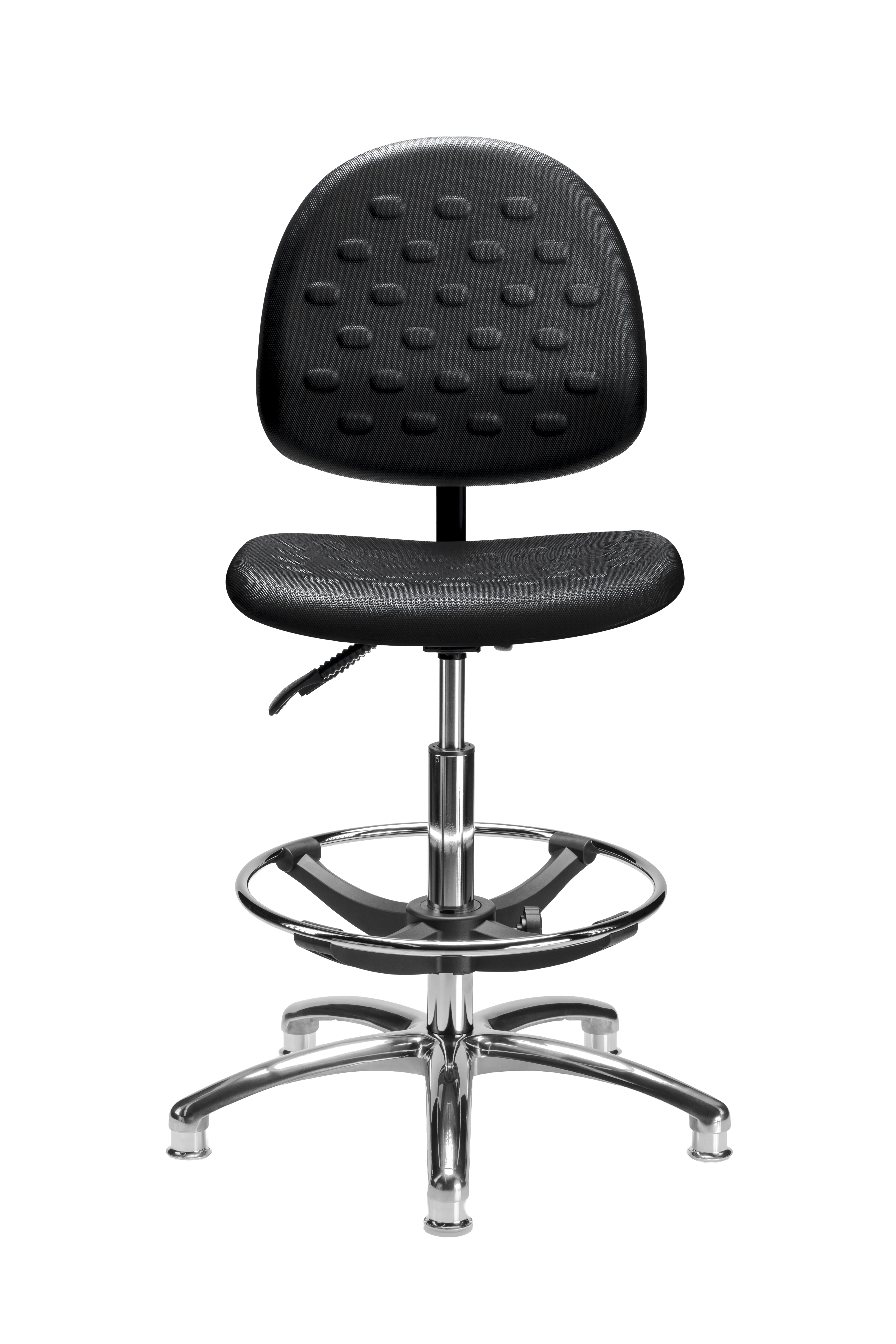 Asiento amplio y respaldo medio de poliuretano ESD tipo piel integral.